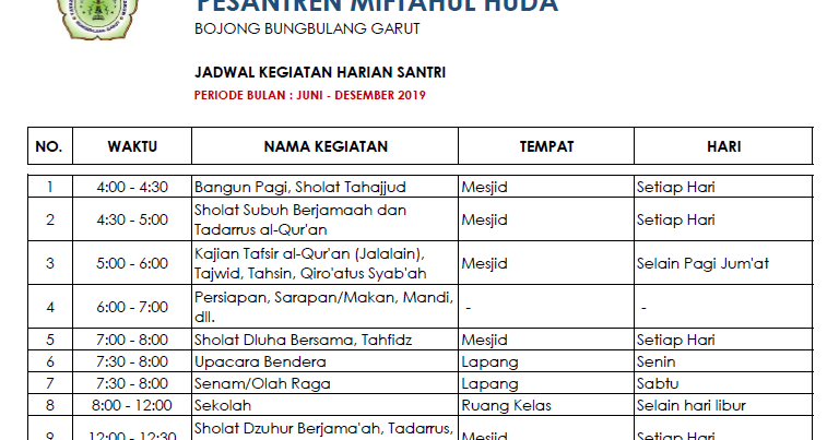 Jadwal Kegiatan Harian Santri 24 Jam Pesantren Miftahul Huda